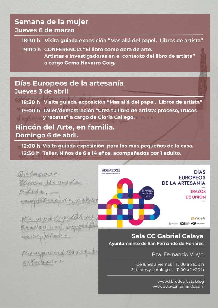 Una mirada diferente a la diversidad de la creación del Oficio y el Arte en España, en clave de mujer, incorporándonos también a las Jornadas conmemorativas del 8M, organizadas por el Ayuntamiento durante la primera semana de la exposición, con las que reivindicamos la memoria de las mujeres, arrancando las actividades con una conferencia inaugural a cargo de Gema Navarro Goig, Doctora en Bellas Artes por la Universidad Complutense de Madrid UCM, en la que nos acercaremos a «El libro como obra de arte. Artistas e investigadoras en el contexto del libro de artista» que tendrá lugar en el Salón de Actos del Centro Cultural Gabriel Celaya, precedida de una visita guiada a cargo de Susana Aparicio Ortiz, comisaria de la exposición.