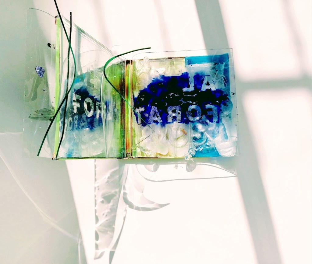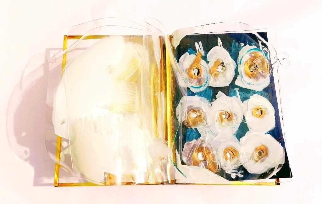 Pieza pintada con esmaltes de baja temperatura y Oro Coloidal sobre vidrio Float termoformado, vidrio soplado y borosilicato y espejo con una base de latón y chorro de Arena