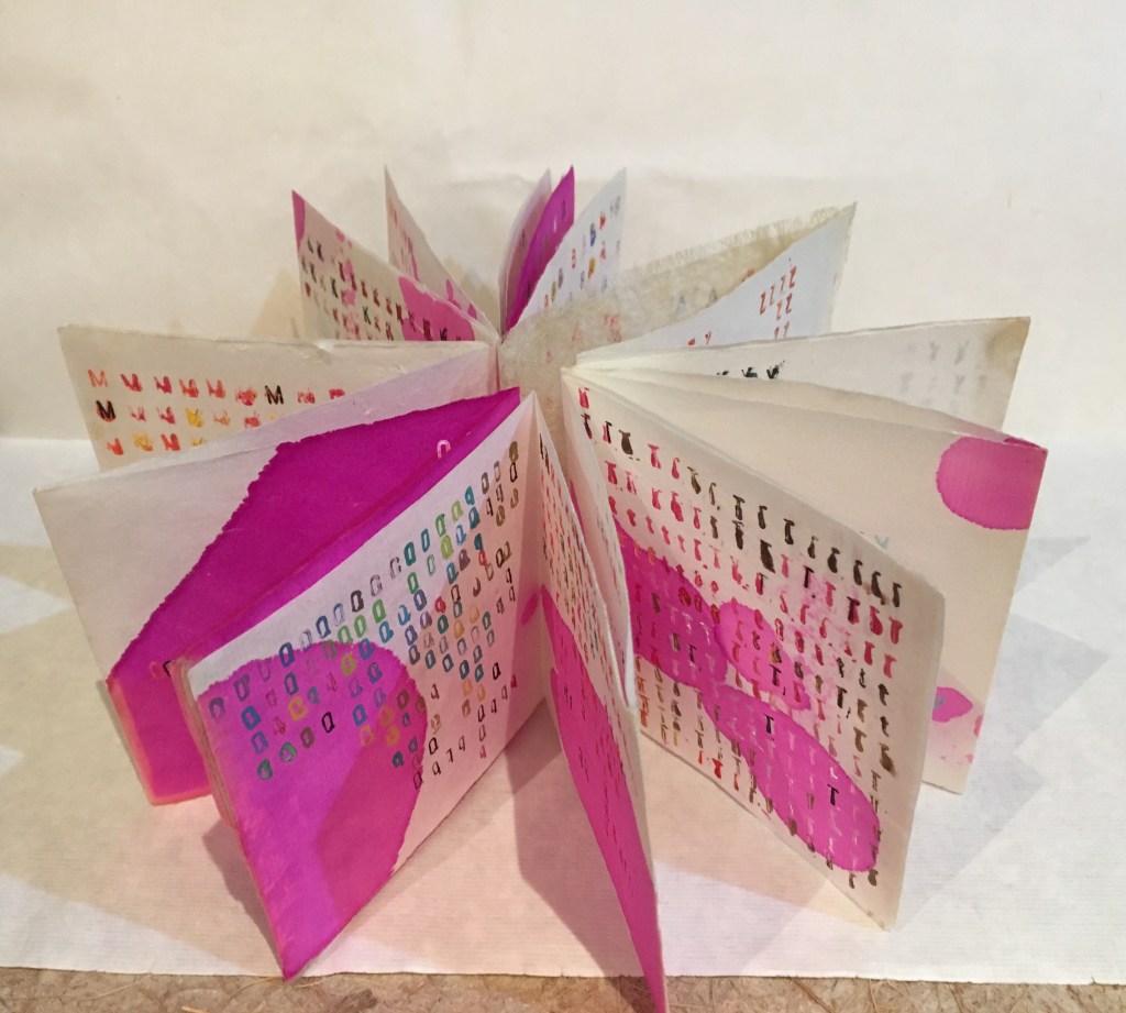 Diccionario, donde el grafismo de las letras del abecedario y las formas de color componen un espacio abstracto. Estampación de tinta y acuarela sobre papel de arroz.