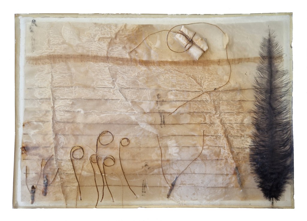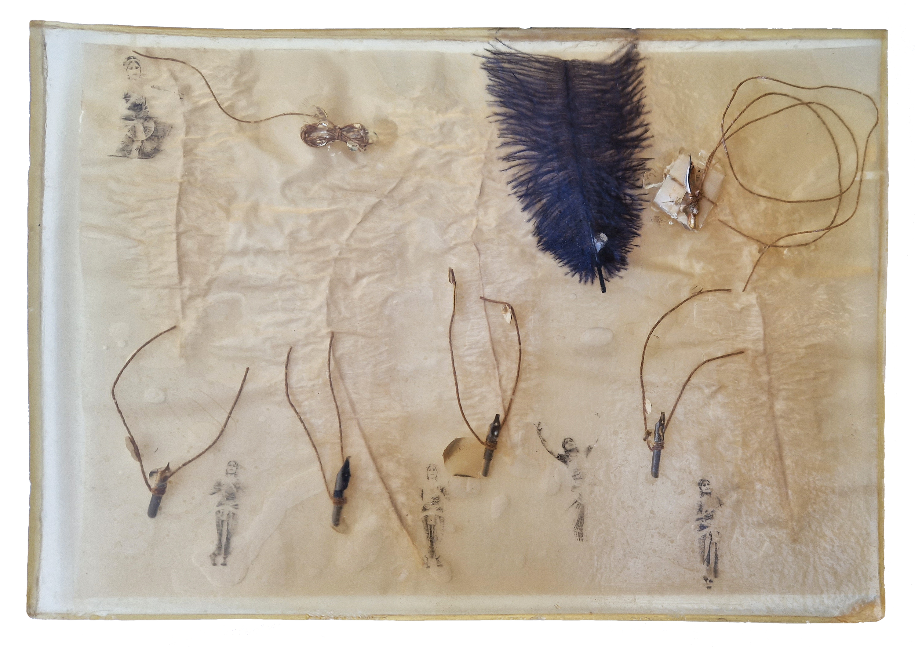 Inclusión de papel vegetal, cuerda, acetato, plumas y plumillas en Resina de poliéster.